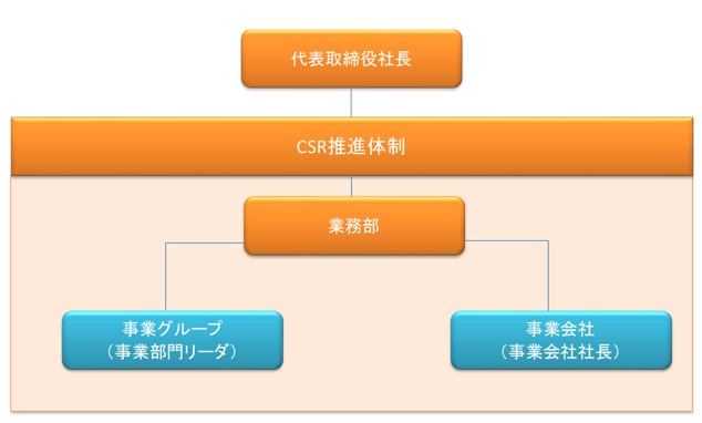グループ全体の環境を推進する組織は業務部となる。業務部中心に、環境方針の策定を行い、環境目標の設定と推進を主導する。